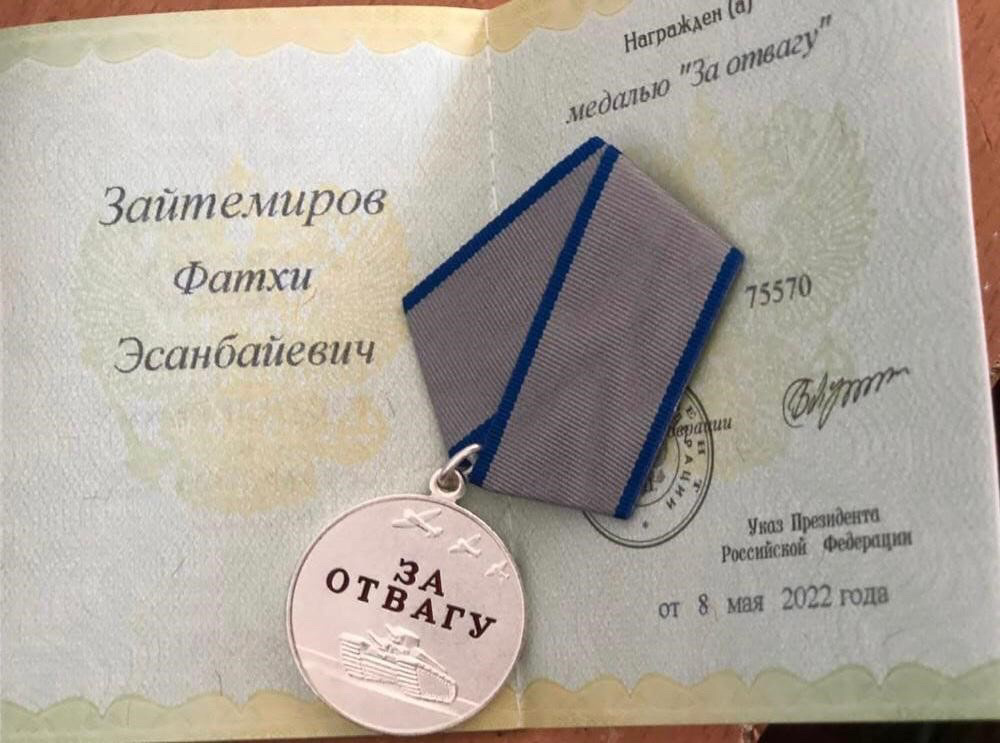 За мужество, смелость, решительность и высочайший профессионализм во время выполнения специальной военной операции Указом Президента Российской Федерации 8 мая 2022 года Зайтемиров Фатхи Эсанбайевич награжден медалью «За отвагу».
