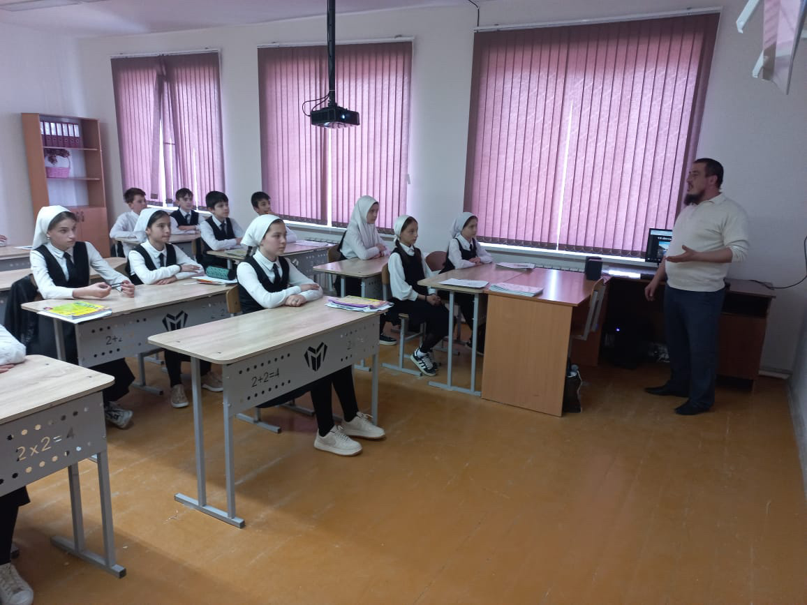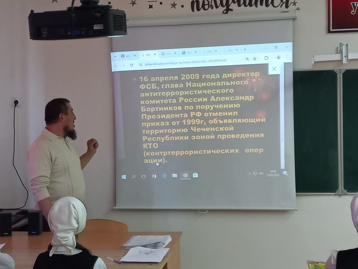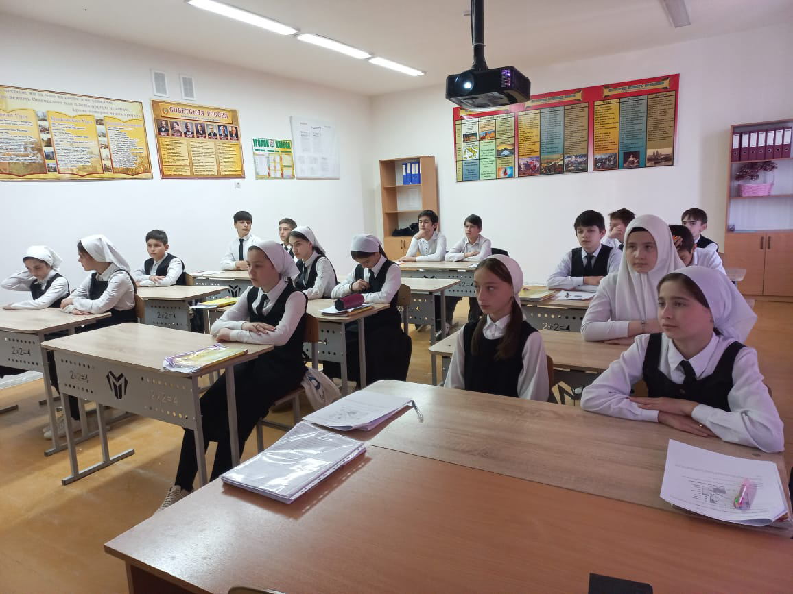 Учитель истории Омаров Х.В. провёл Урок мужества на тему: " Глава Чеченской Республики, Герой России Р.А.Кадыров-инициатор отмены режима контртеррористической операции"