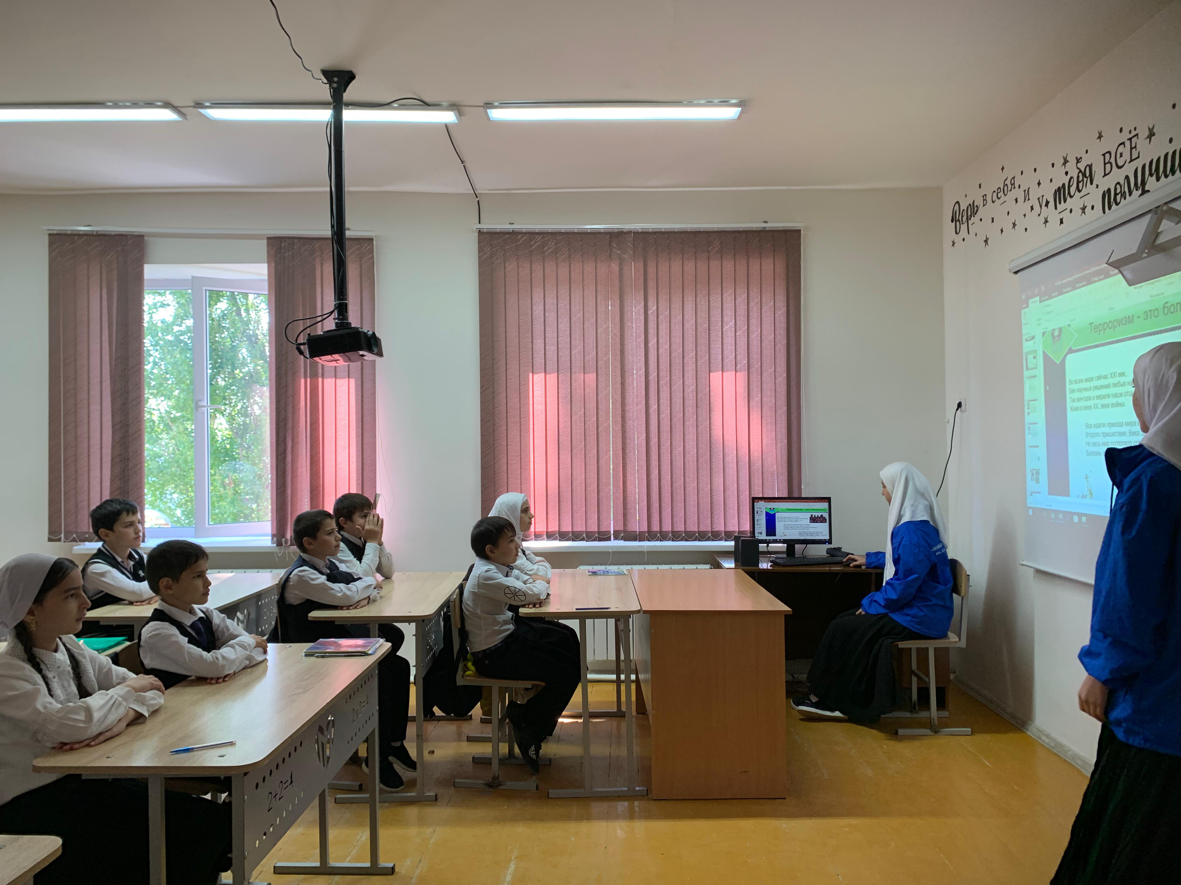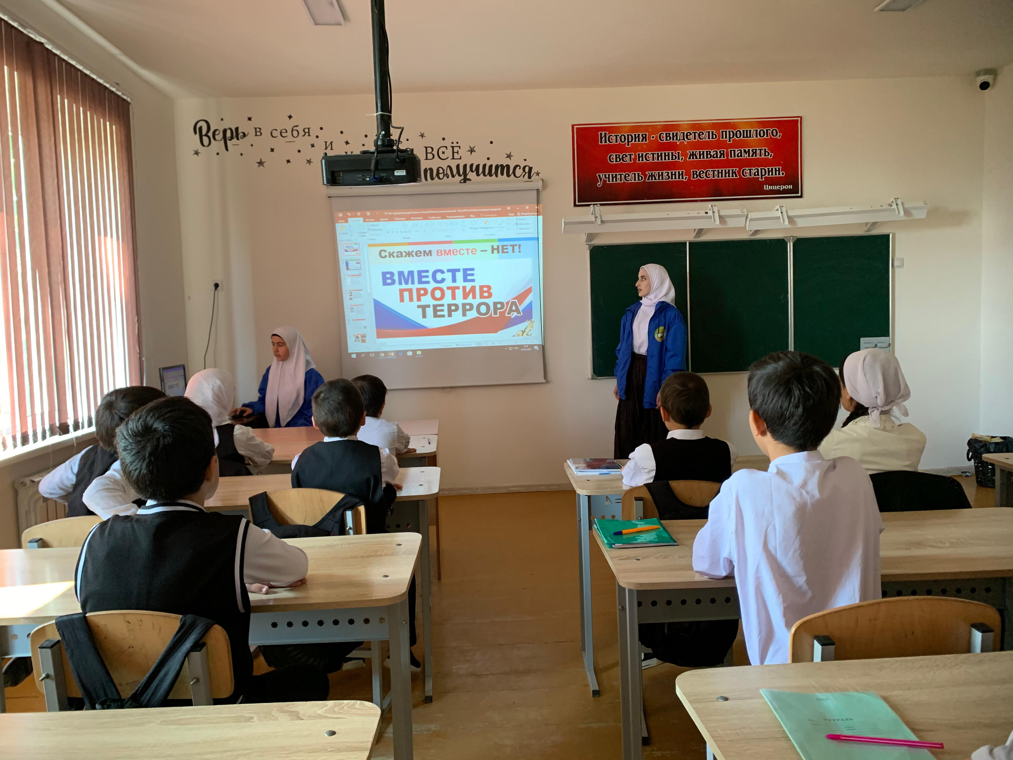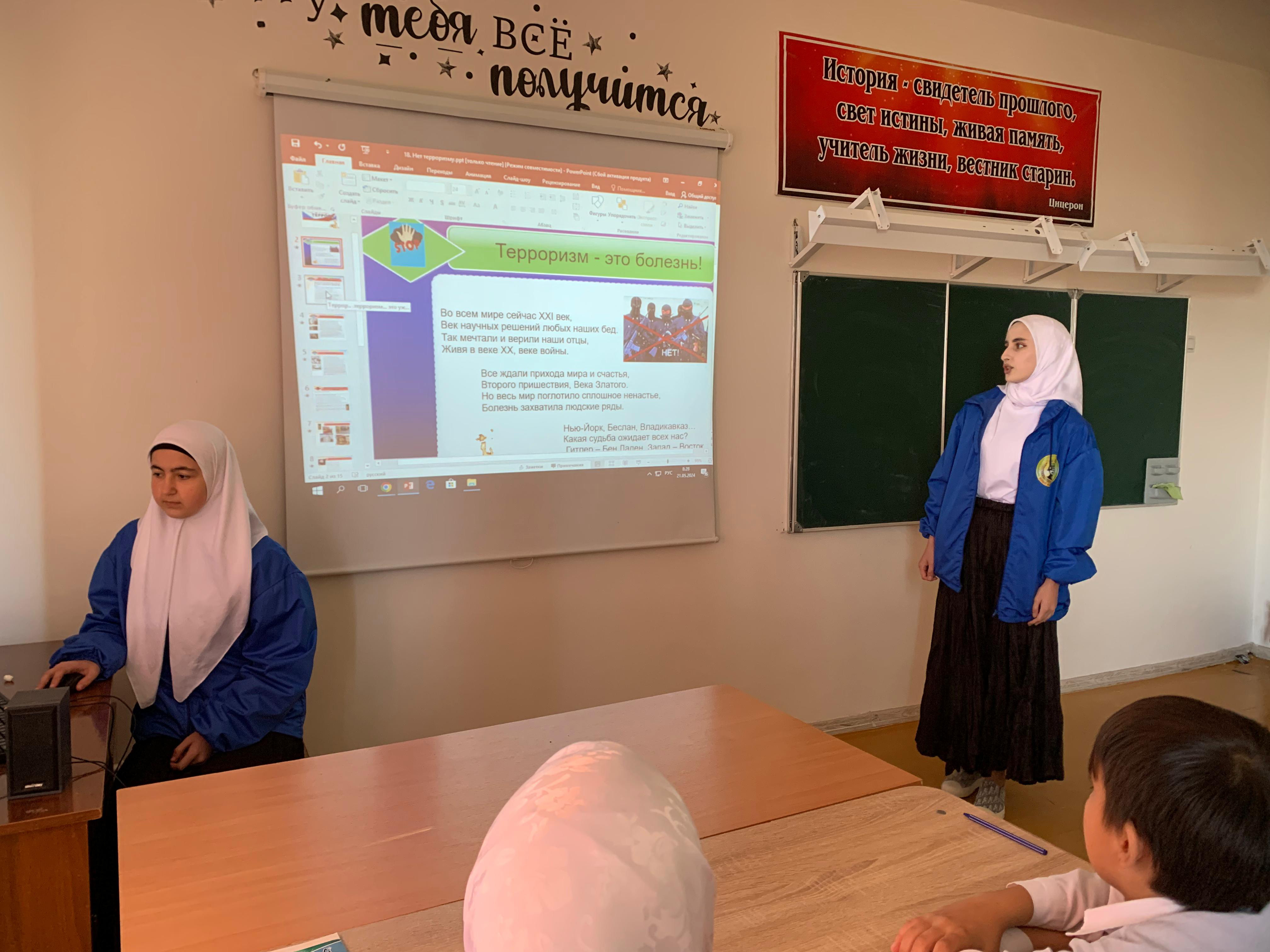 Члены ЮК,обучающиеся 10 кл Палаева Иман и Мацаева Селима провели для обучающихся 5 "б" класса беседу на тему:"Вместе против террора"