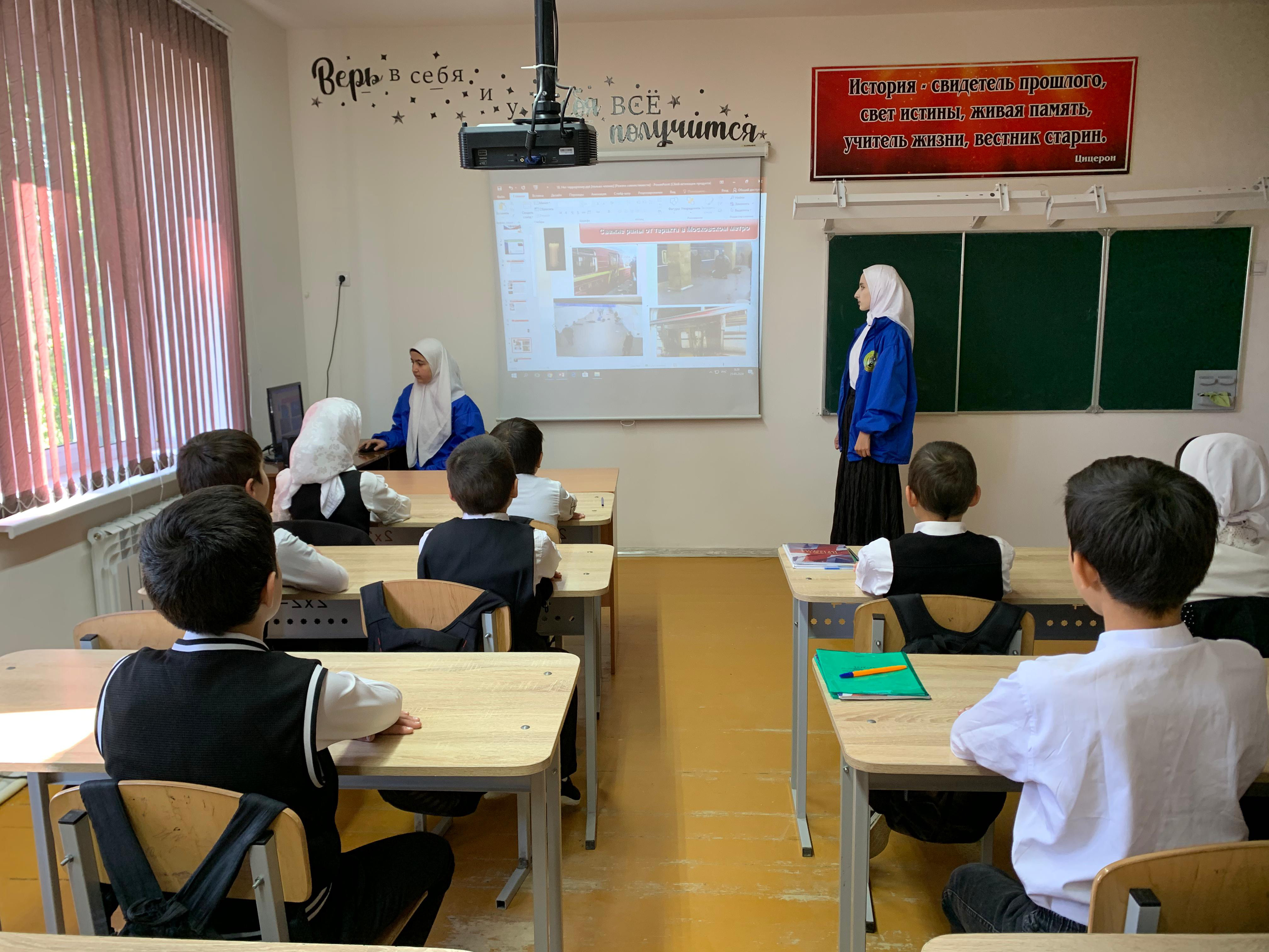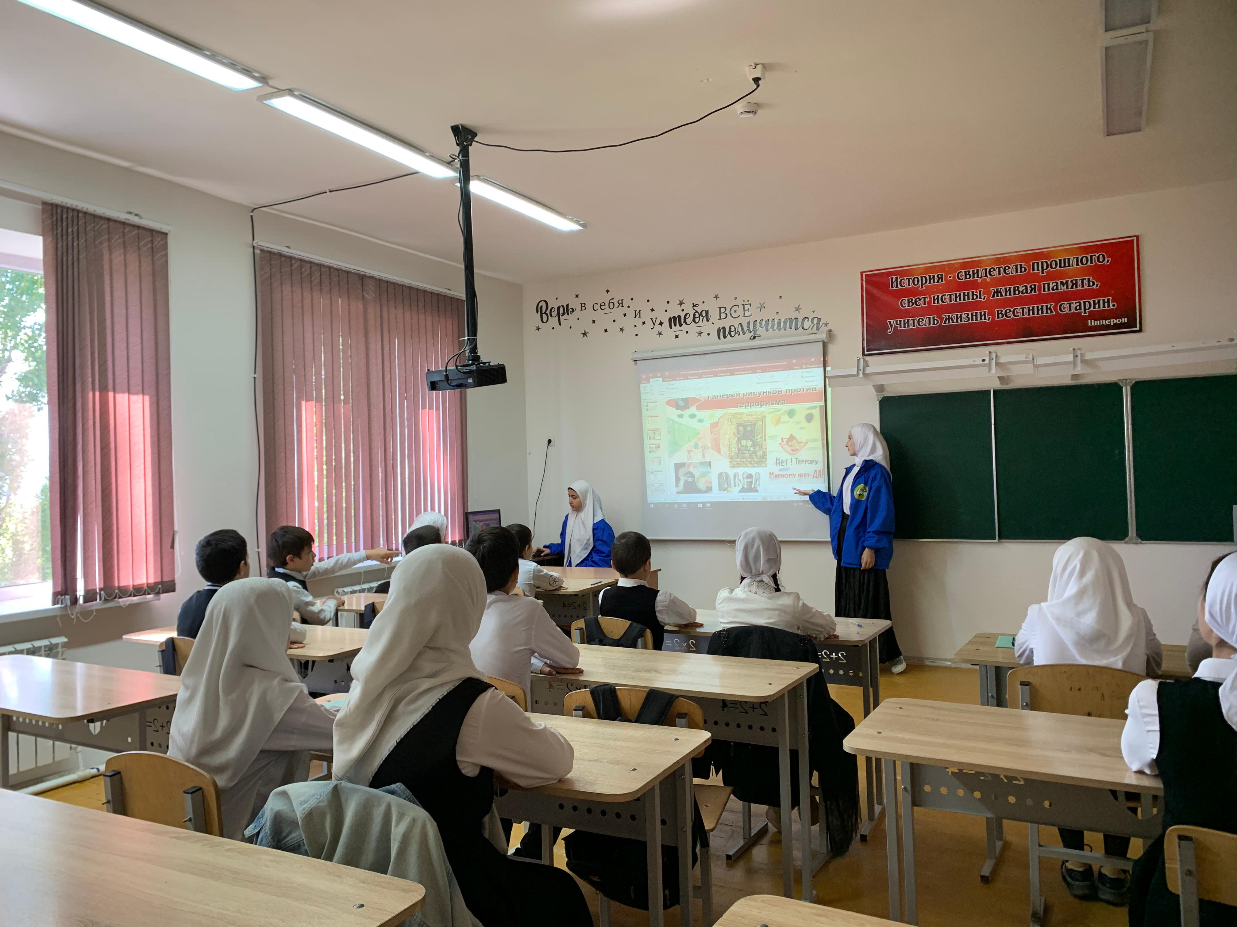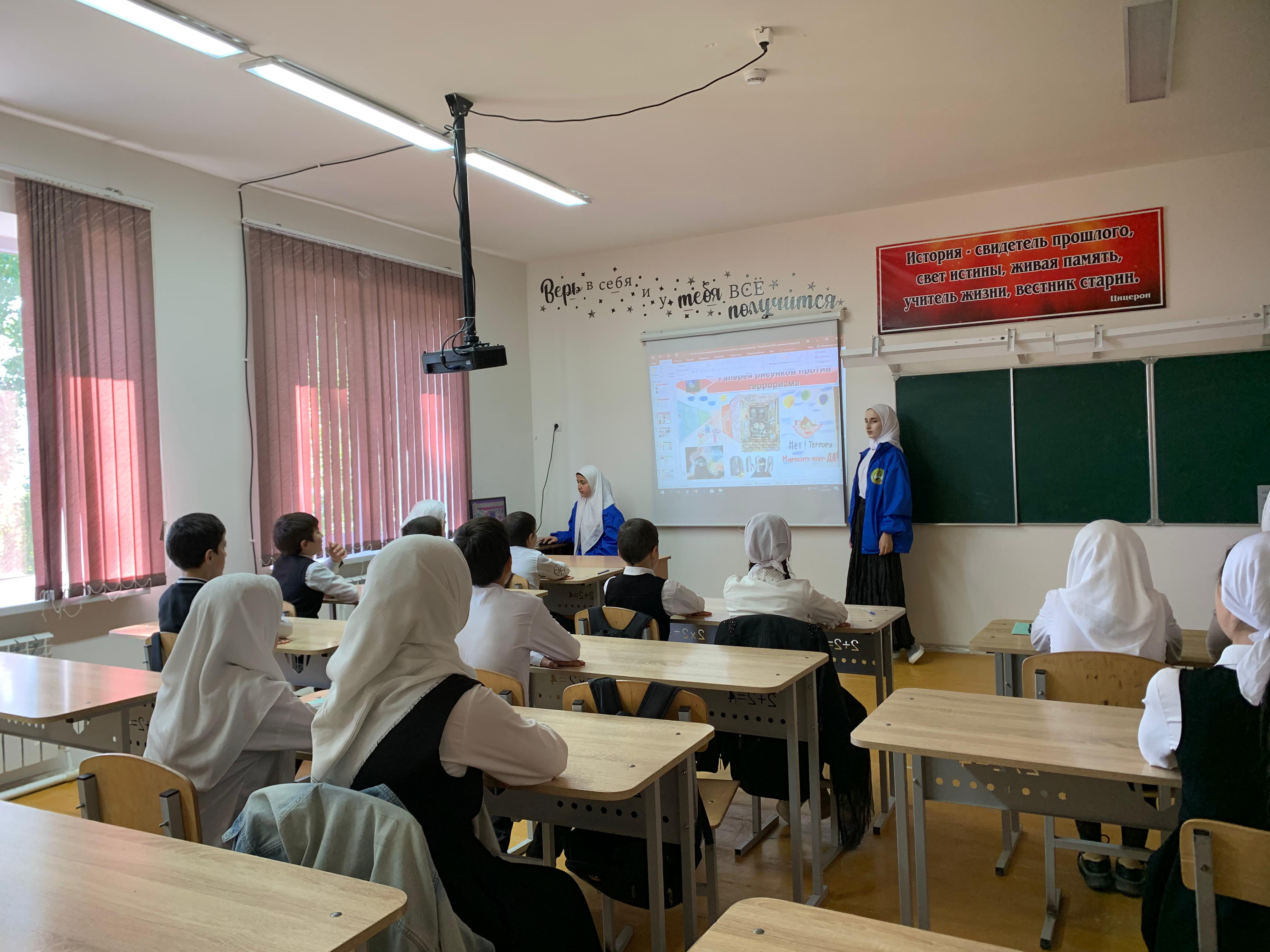 Члены ЮК,обучающиеся 10 кл Палаева Иман и Мацаева Селима провели для обучающихся 5 "б" класса беседу на тему:"Вместе против террора"