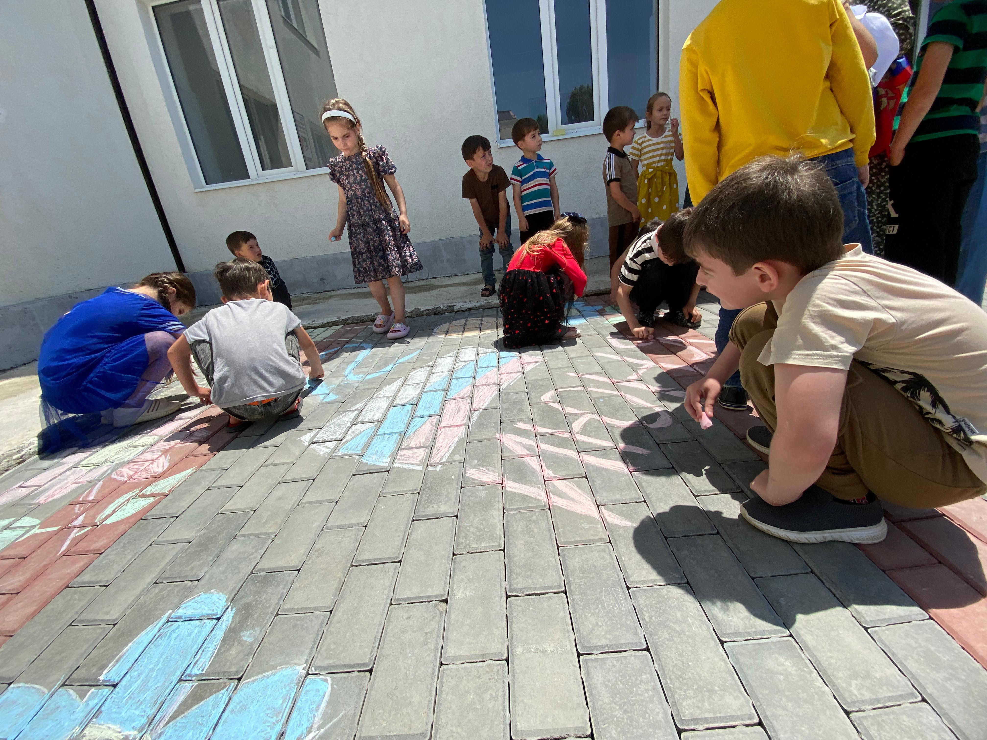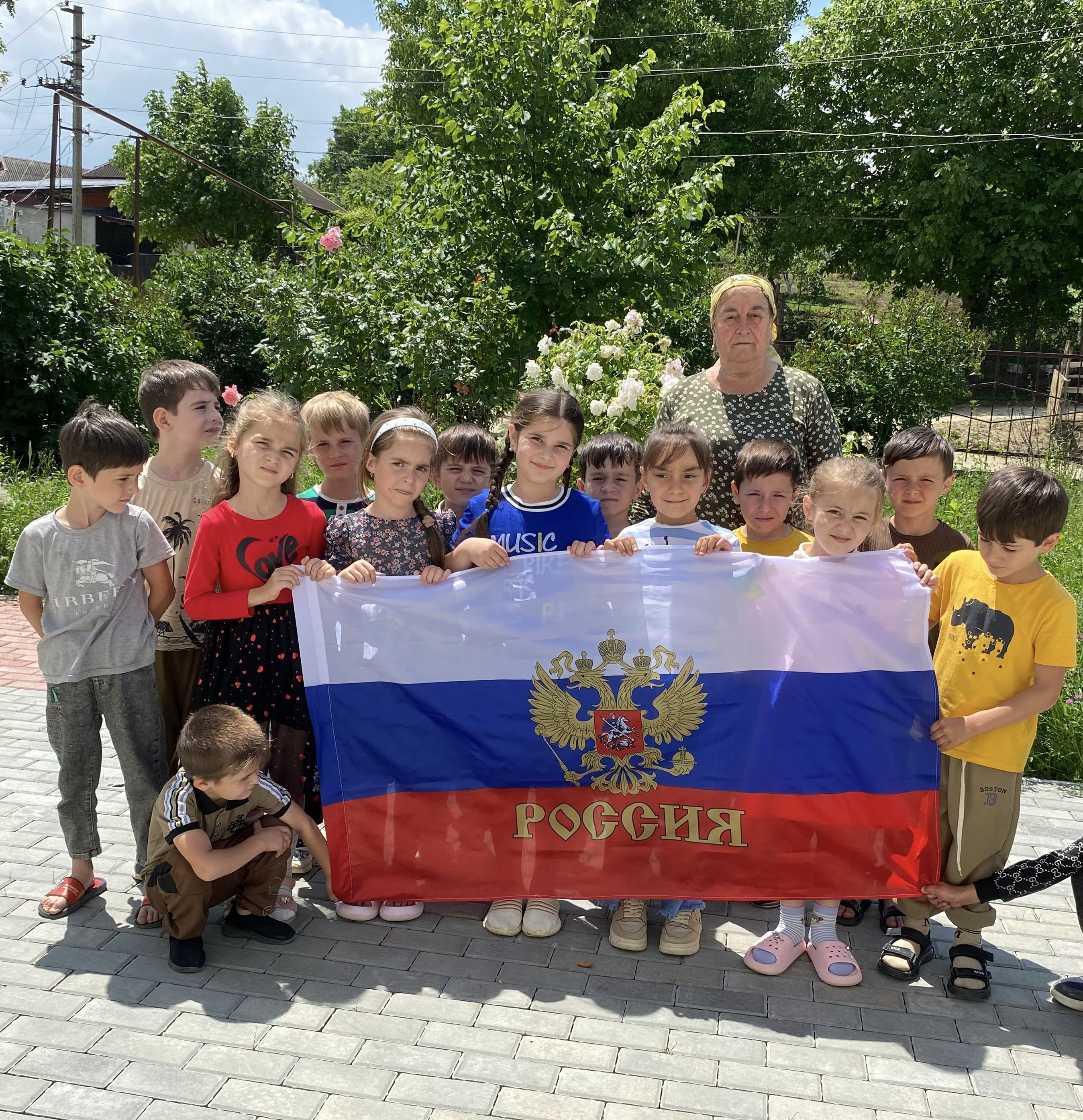 Целью мероприятия, проходившего на детской площадке школы ,было формирование представлений о России как о государстве, о родной стране, воспитание чувства любви к родному краю, Родине. Через беседы Албасхановой З.К. и Мусаниповой М.С., учителей начальных классов, дети наглядно смогли увидеть насколько большая наша страна, сколько народов живет на ее обширной территории в мире и согласии. Детям было рассказано, почему наш флаг состоит из трех цветов, и что обозначает каждый цвет. Дети на улице рисовали мелками на асфальте на тему «Флаг России».