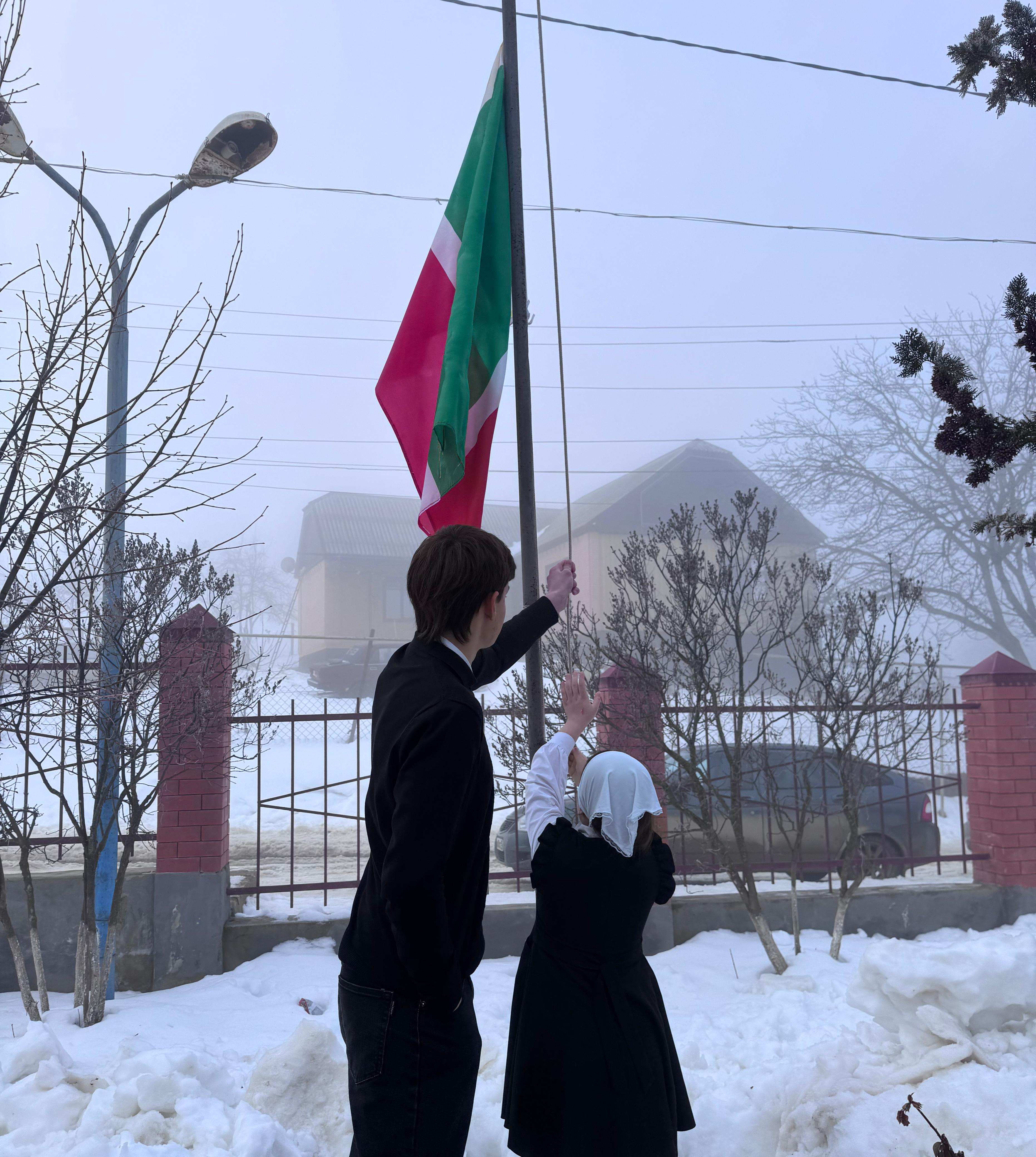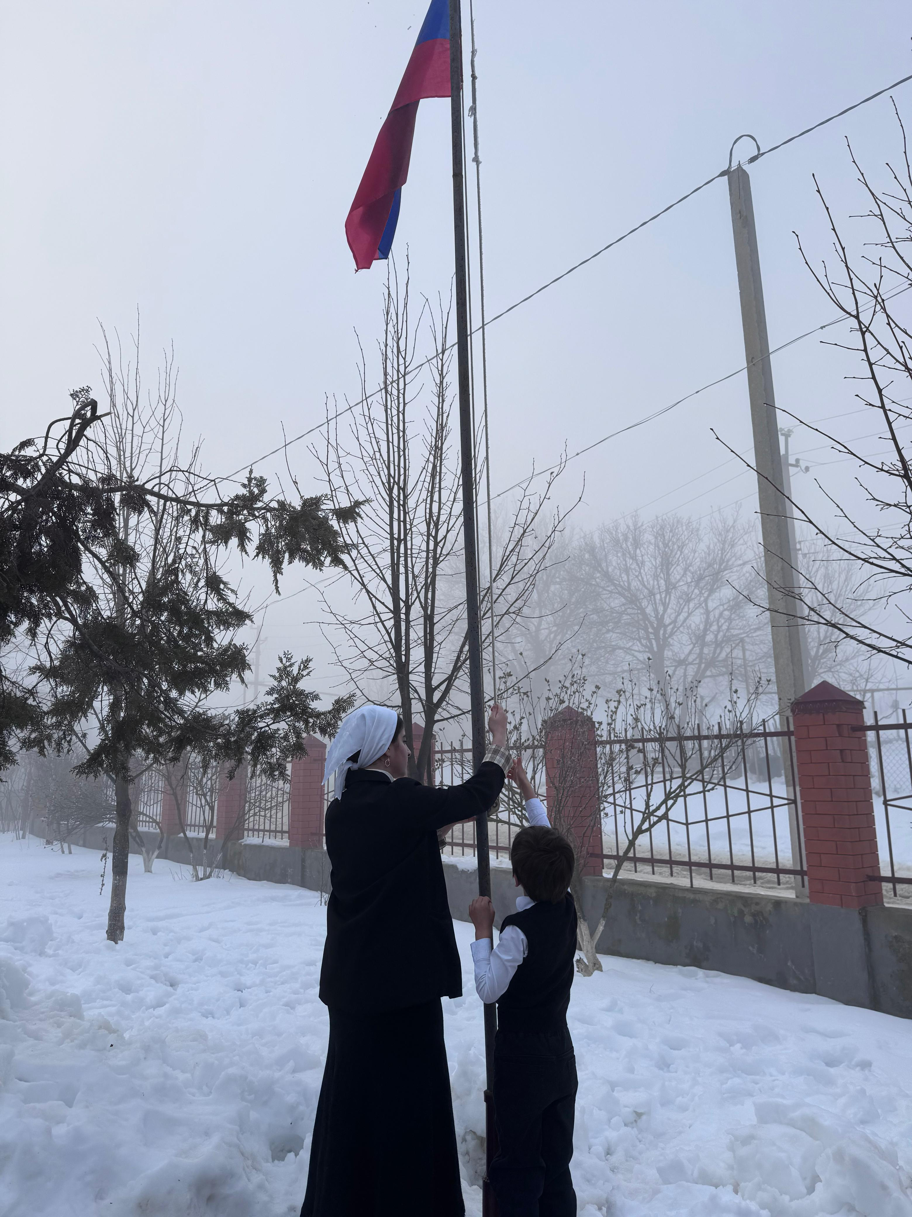 27.01.2025 г в МБОУ"СОШ1 им.Билимханова С.Г. с.Зандак" членами"ЮК" была проведена еженедельная общешкольная линейка с торжественной церемонией вноса Государственных флагов Российской Федерации и Чеченской Республики.