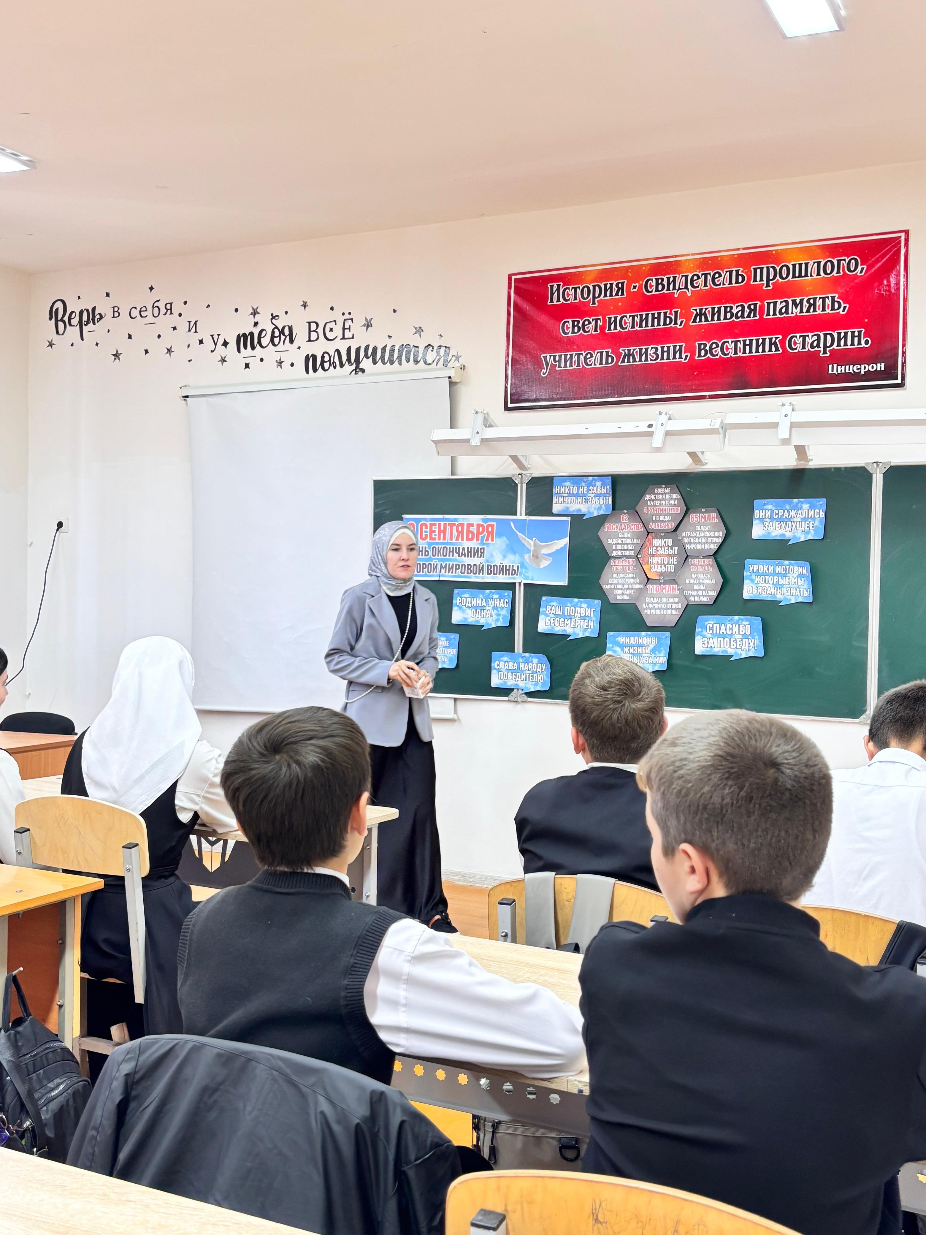 Классный час в 6 «б» классе: "Окончание Второй мировой войны"был посвящён памятной дате 3 сентября — Дню окончания Второй мировой войны. Война завершилась 2 сентября 1945 года подписанием Акта о капитуляции Японии, что стало последним актом в истории крупнейшего мирового вооружённого конфликта. Классный час призван напомнить о героизме советского народа и важности мира.