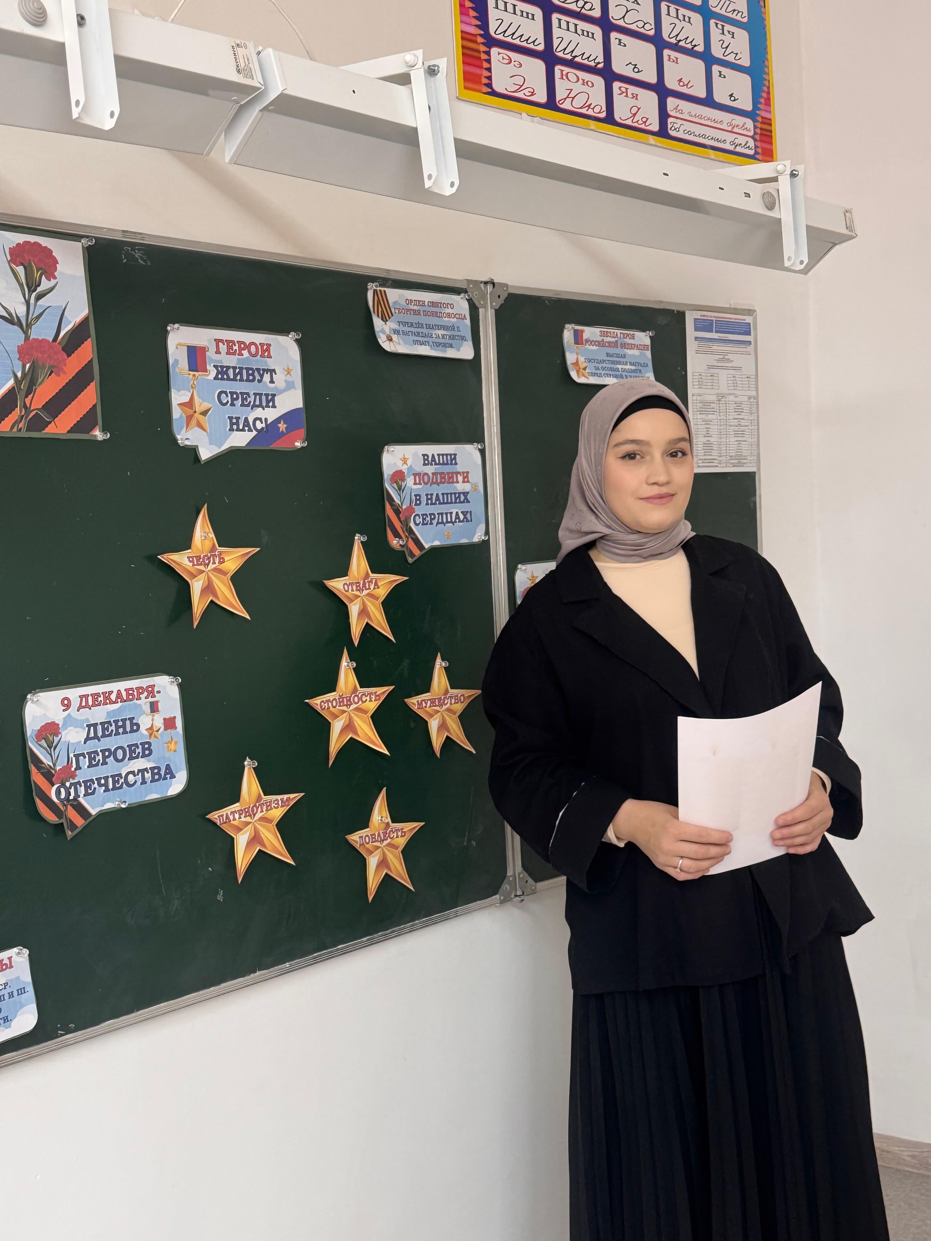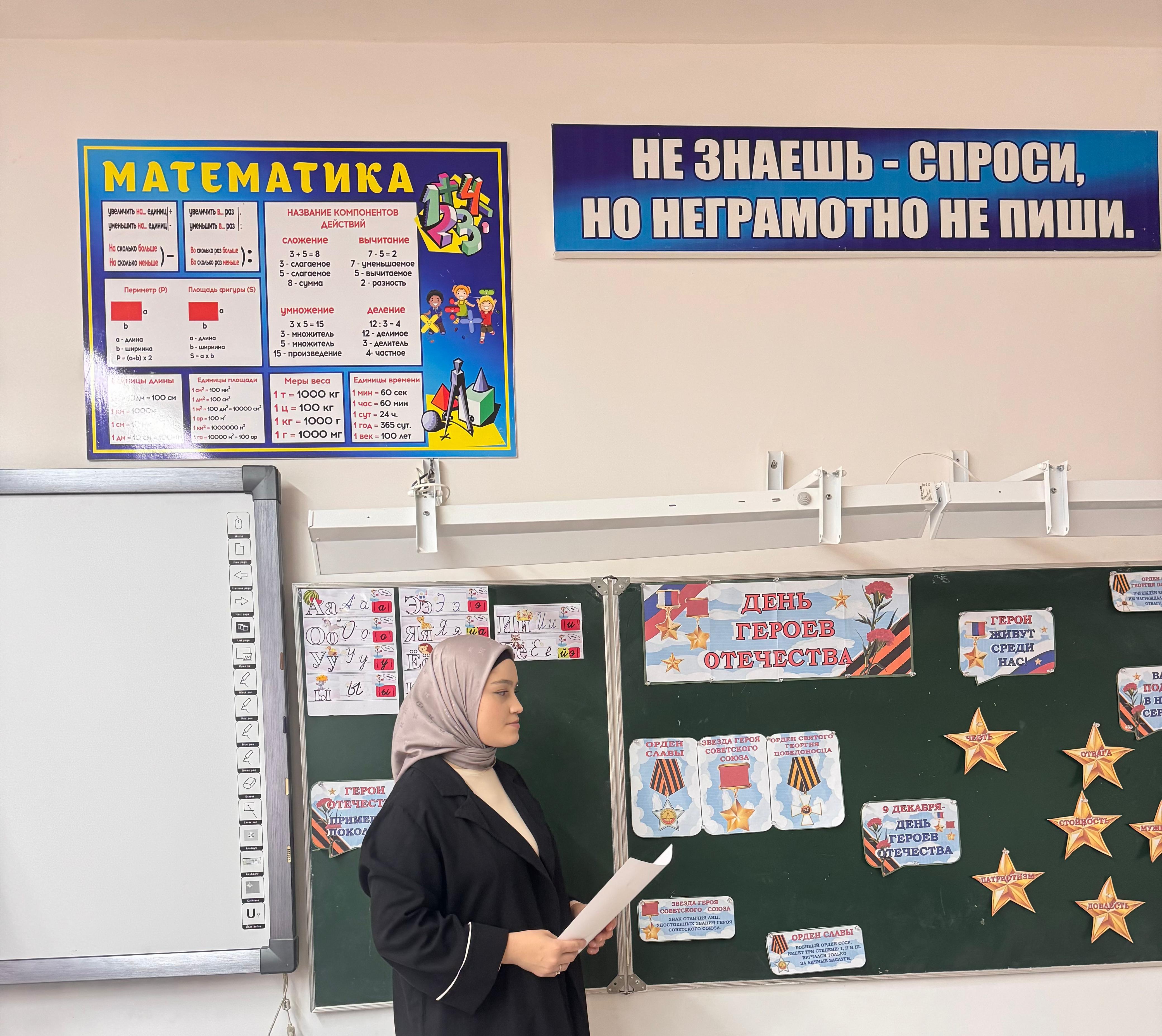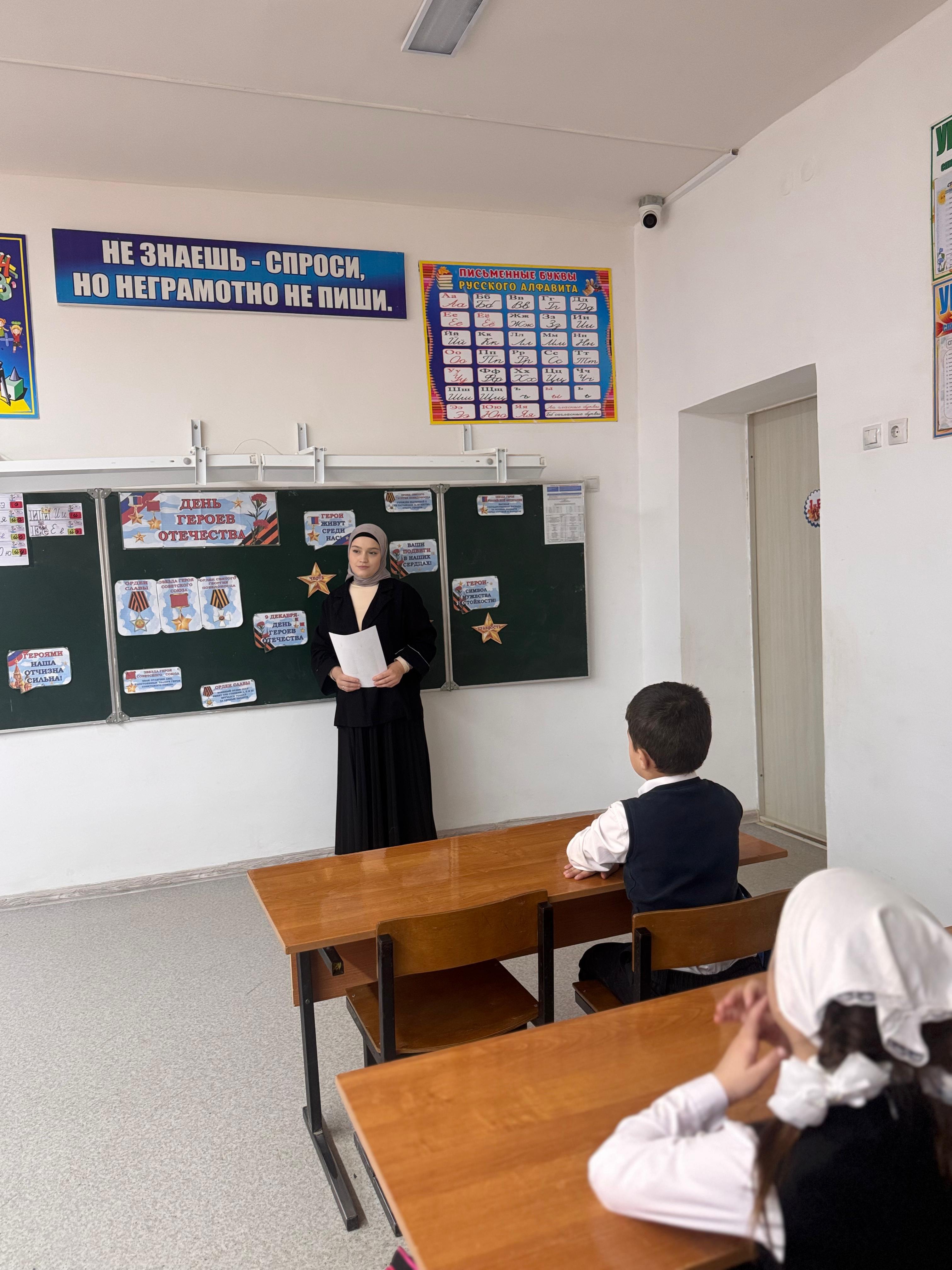 Классный руководитель 1-го класса Джамалдинова Л.А.провела классный час для обучающихся 1 класса ко Дню Героев Отечества. Беседа была посвящена знакомству с понятиями «герой» и «подвиг», воспитанию патриотизма, гордости и уважения к истории России с целью расширить знания о героях, показать важность служения Родине и вдохновить детей на добрые поступки, формируя гражданственность и любовь к Отечеству.