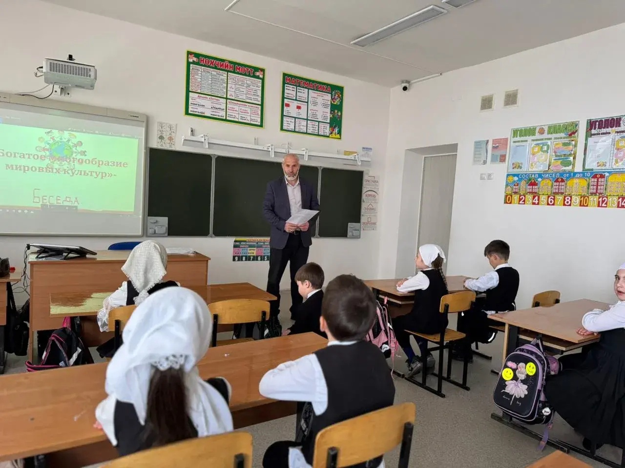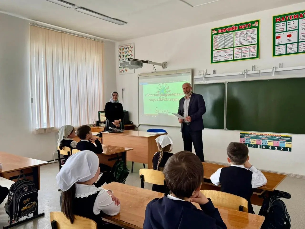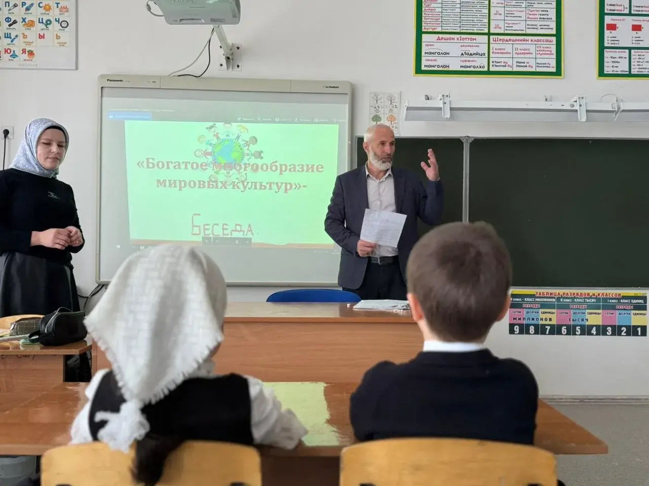 Классный руководитель 2 "Б" класса, Мусанипова М.С., совместно с педагогом-организатором по духовно-нравственному воспитанию Магамедовым И.И. провели для учащихся тематический классный час "Богатое многообразие мировых культур".